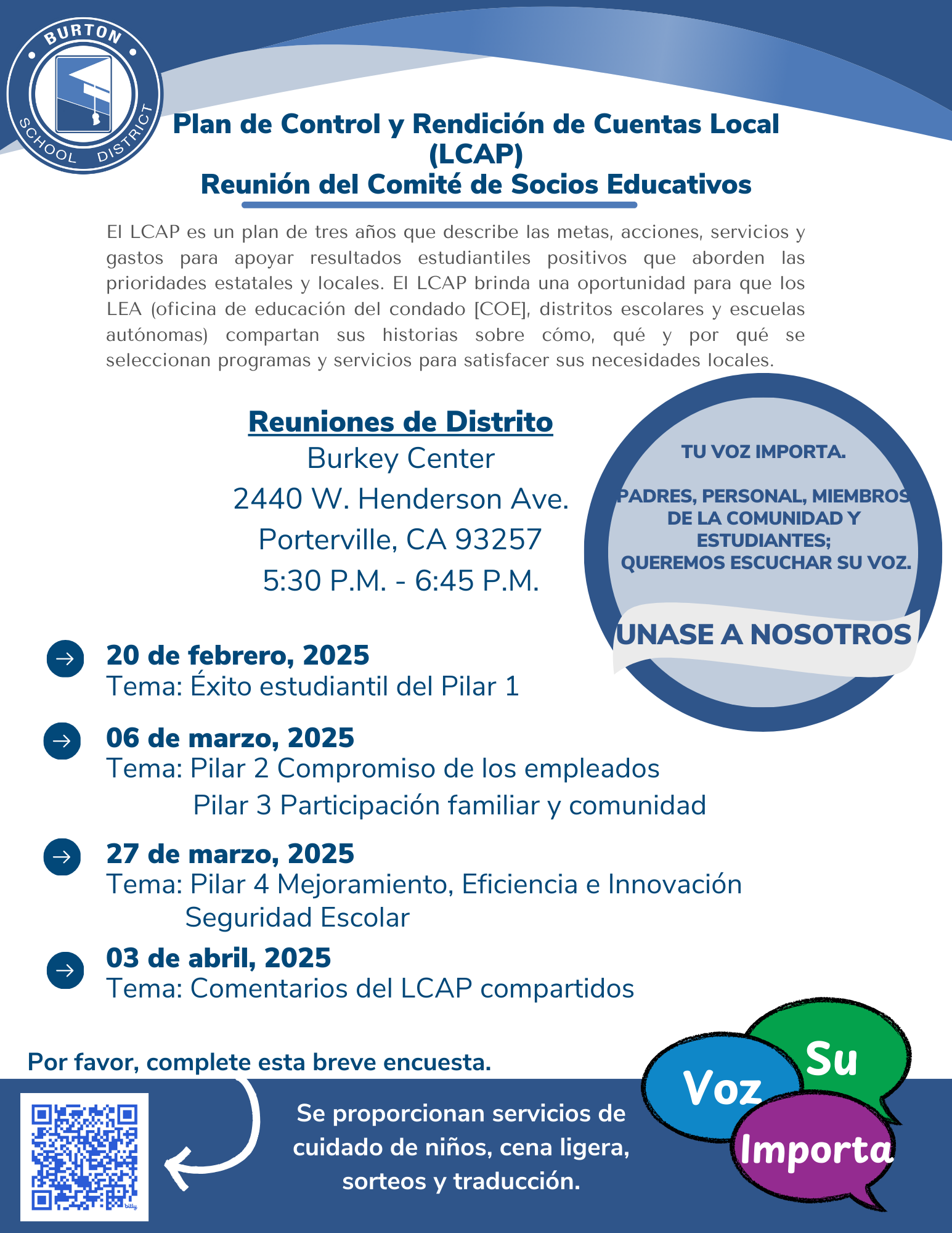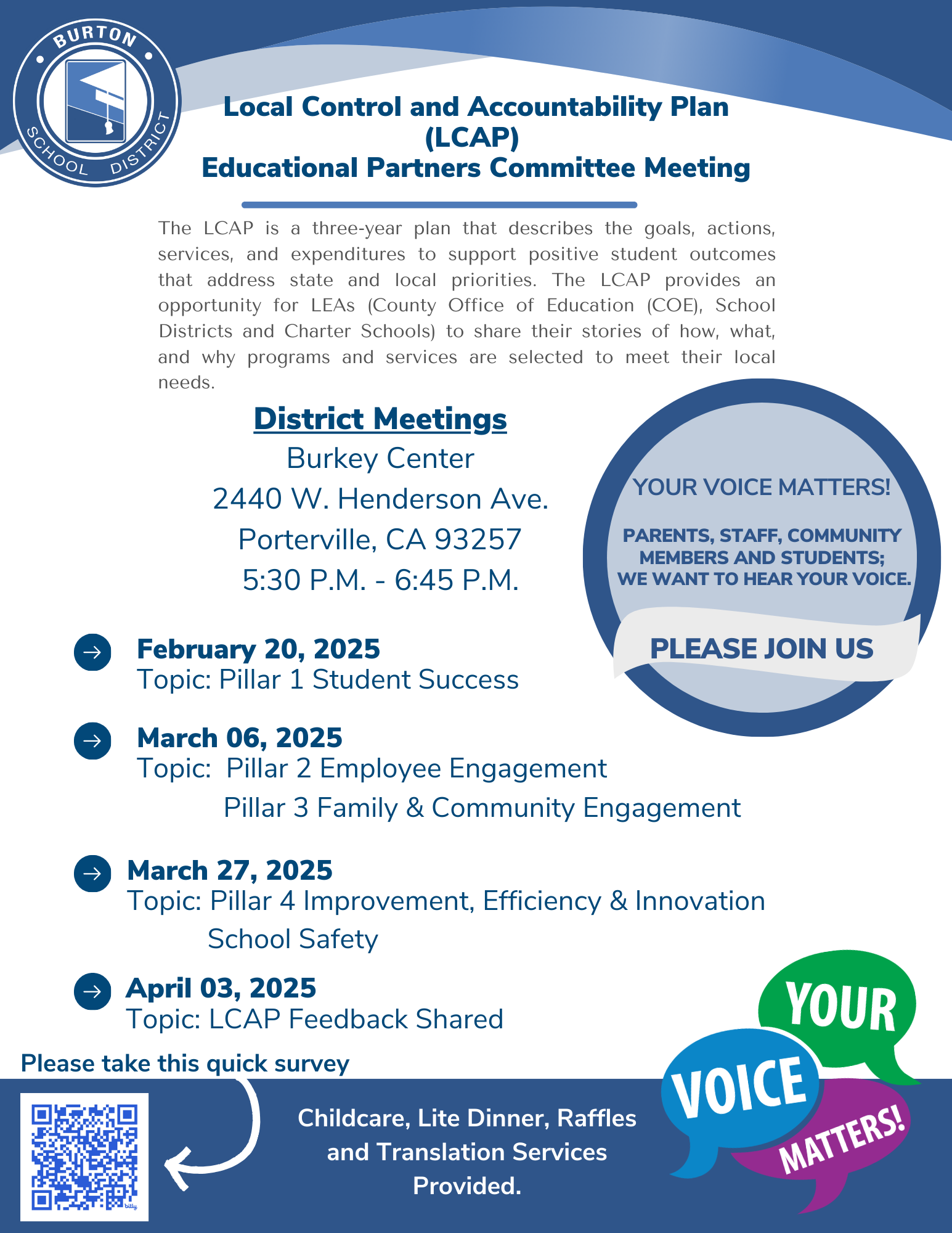 We invite you to join us for our upcoming Local Control and Accountability Plan (LCAP) meetings. Your input is vital as we work together to ensure the best educational experience for our students.