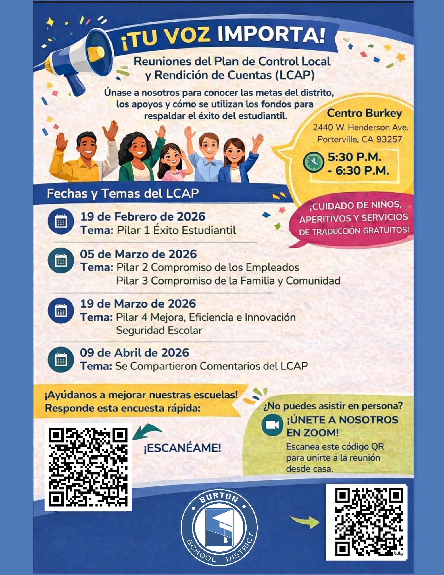 We would like to invite you to join us for our upcoming LCAP (Local Control and Accountability Plan) meetings. These meetings are an important opportunity for families to share their thoughts, ideas, and feedback about our schools. The LCAP helps guide decisions about programs, resources, and supports that impact student learning and success.