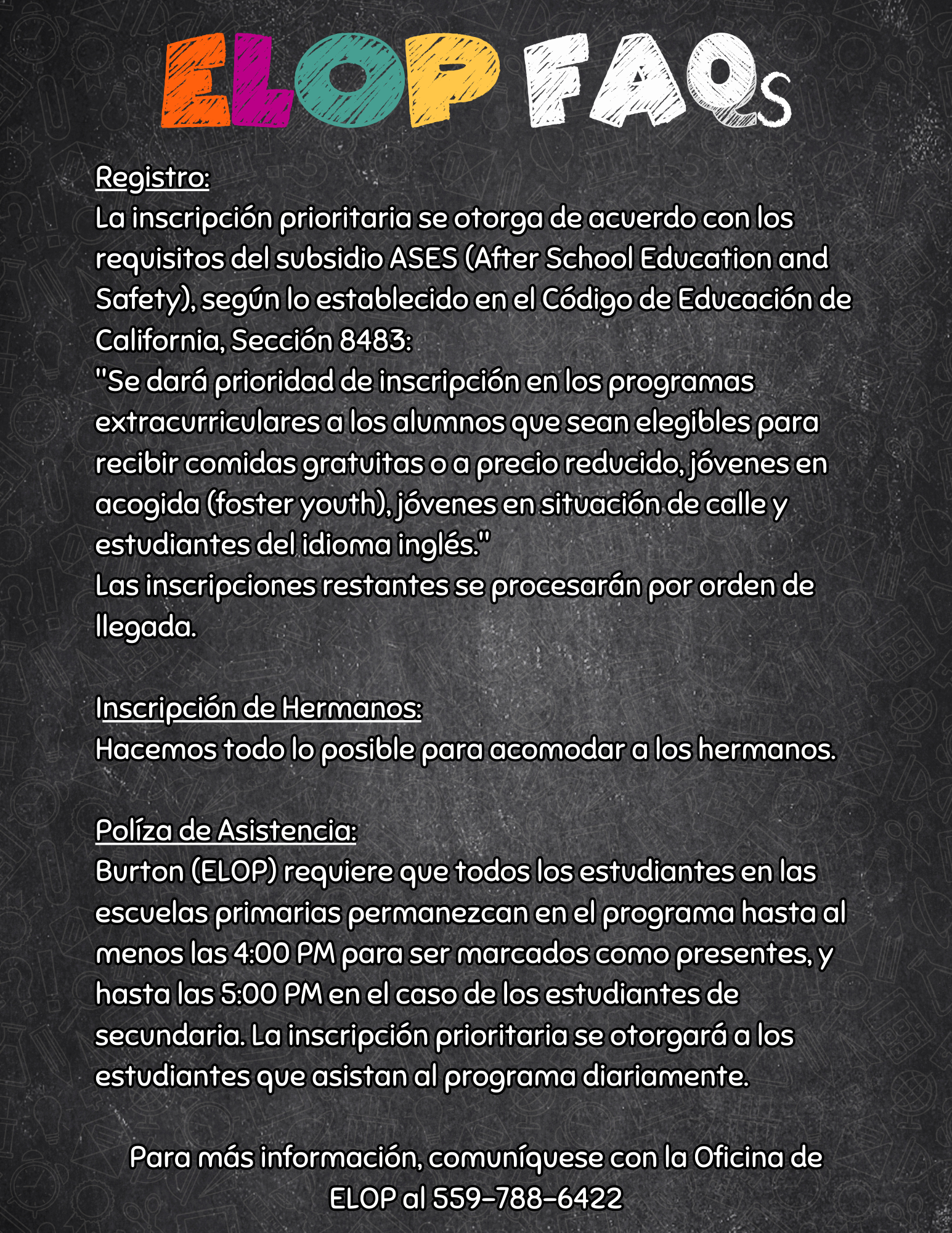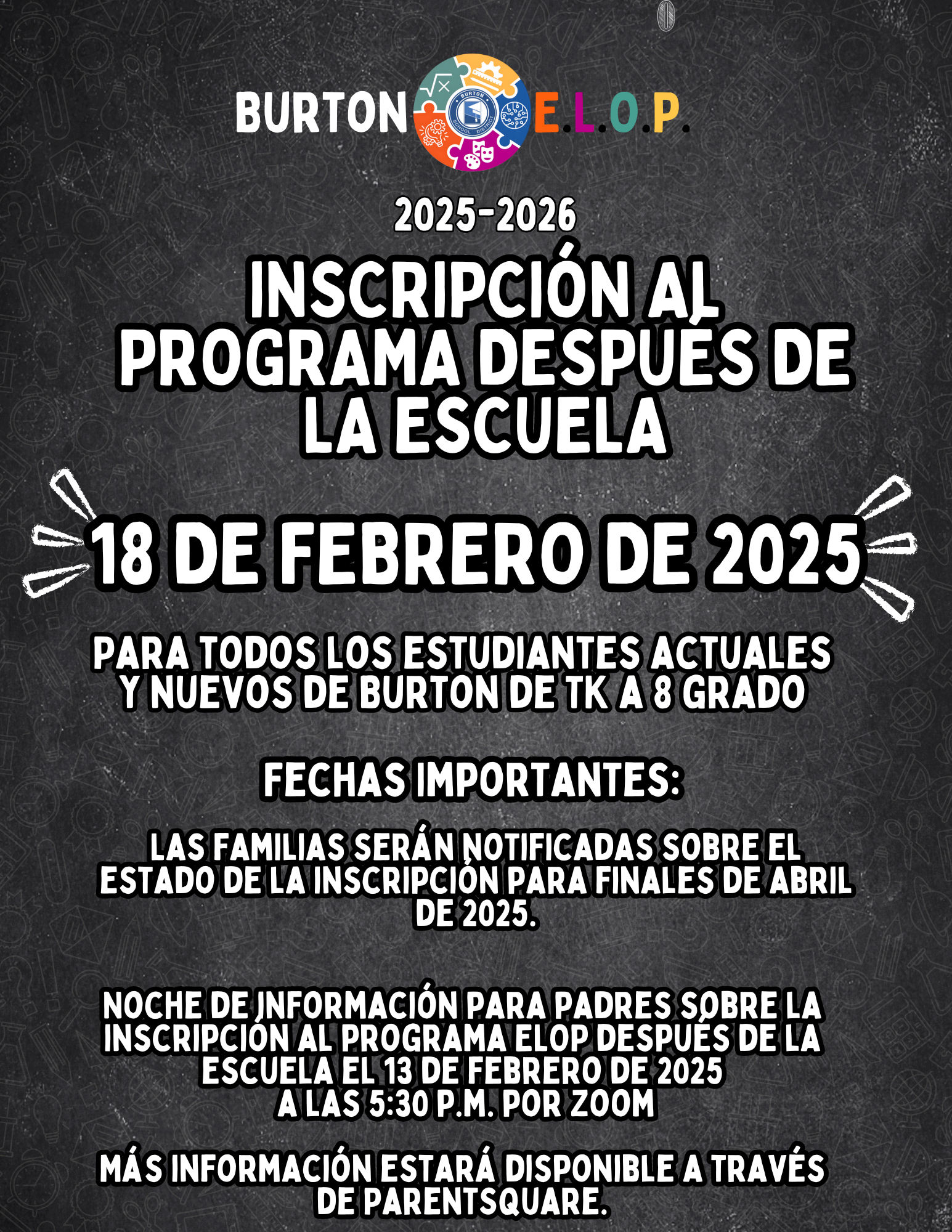 Tomorrow evening at 5:30pm we will be holding a parent information night on the ELOP After School Registration process. The webinar will be held on February 13th at 5:30pm via zoom https://us02web.zoom.us/j/84900179958. This year we will be doing online enrollment through a software that connects to our Student Information System, Aeries. Registration will be for ALL current and incoming Burton students. It is very important that your information is updated with your school secretary. Misinformation could prohibit you from registering. Registration will open on February 18th, 2025 at 9am. Please keep an eye on your ParentSquare and our social media channels for more information.